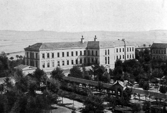 - der Heilanstalt für Kranke, die besondere Pflege und Aufsicht bedürfen, sowohl auf der Männer-, als auch auf der Frauenseite durch gedeckte Gänge mit dem Administrationsgebäude, und mit der Anstaltsküche und Kirche verbunden.